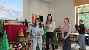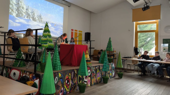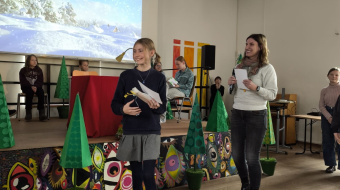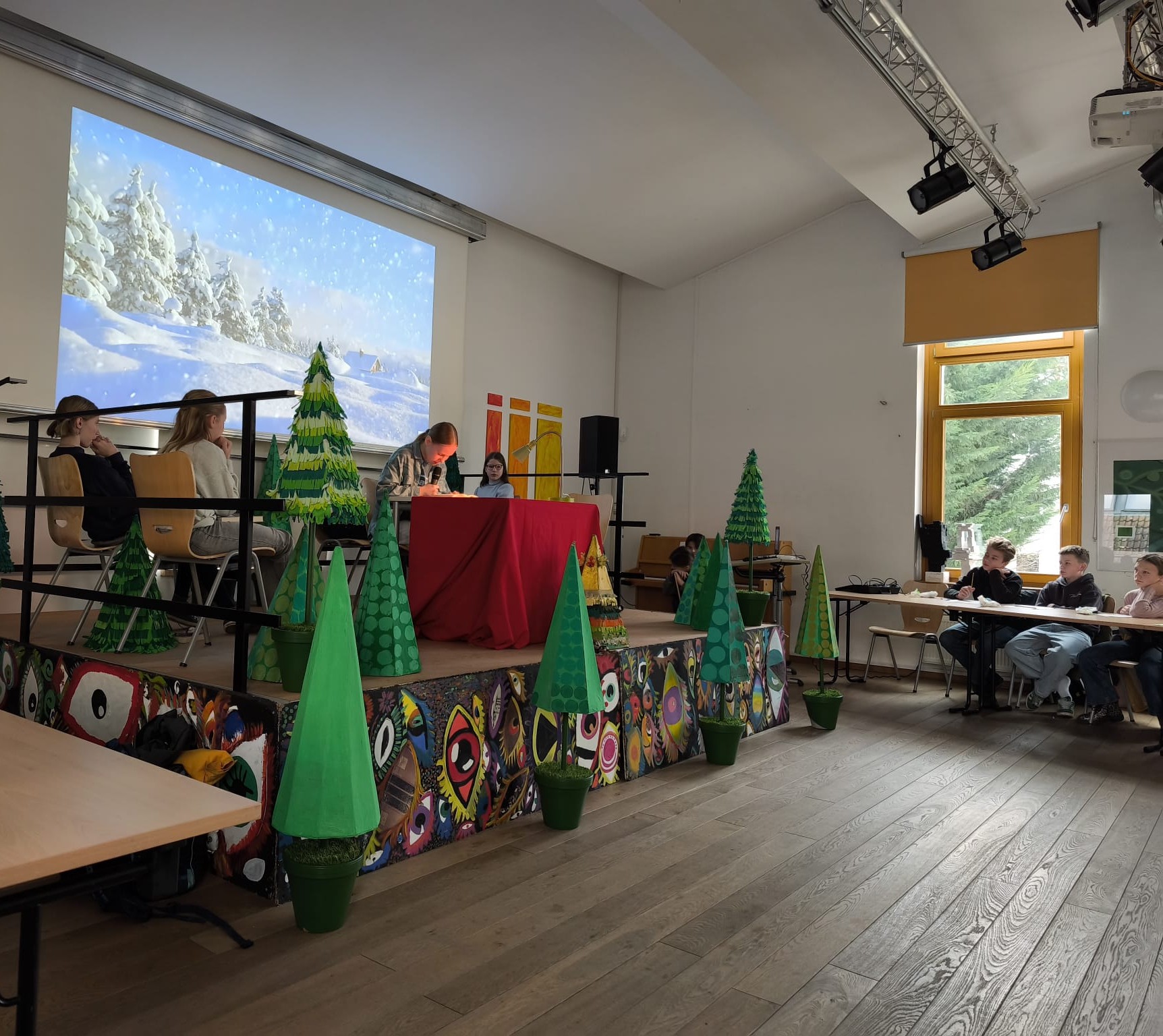 Für eine märchenhafte Atmosphäre sorgten die Klasse 6b und Frau Lunow, die die Bühne in einen kleinen Winterwald verwandelten. Musikalisch umrahmt wurde der Wettbewerb von Ferdinand und Till am Klavier, während Ziad, Oskar und Viktor aus der 6e souverän durch das Programm führten.